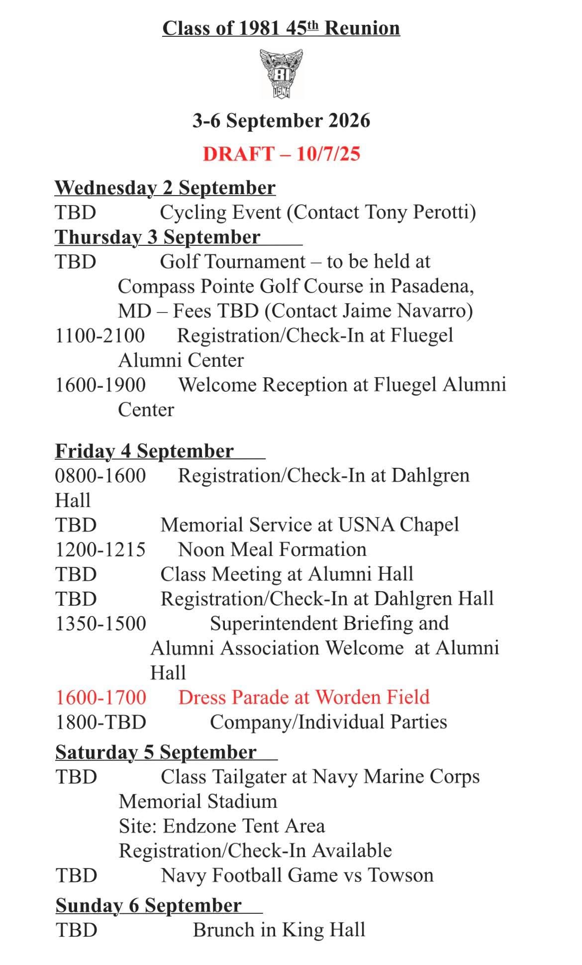 45th Reunion for Class of '81 will be held on Labor Day Weekend, Sept. 3-6, 2026.
